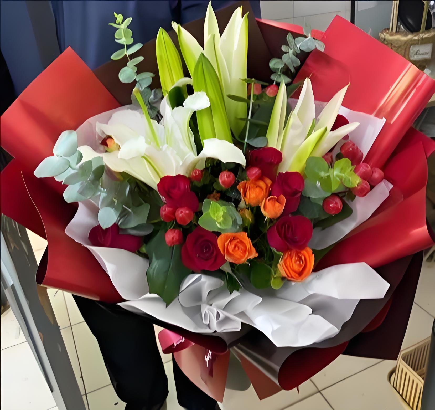 恩施州恩施市花店包11枝红玫瑰、2枝多头白百合、6枝橙色多头玫瑰、红豆、尤加利叶